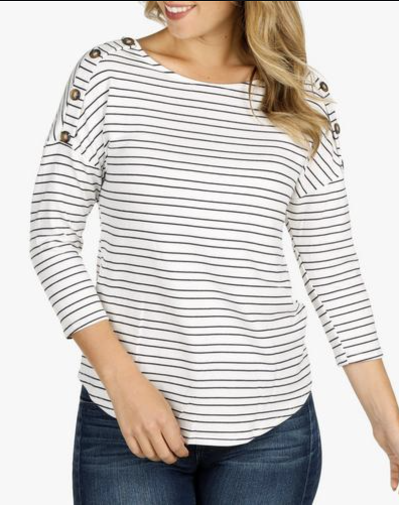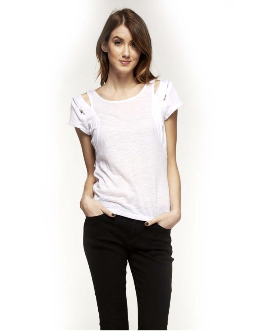 A row of buttons or a small zipper provide fun but subtle shoulder detail.