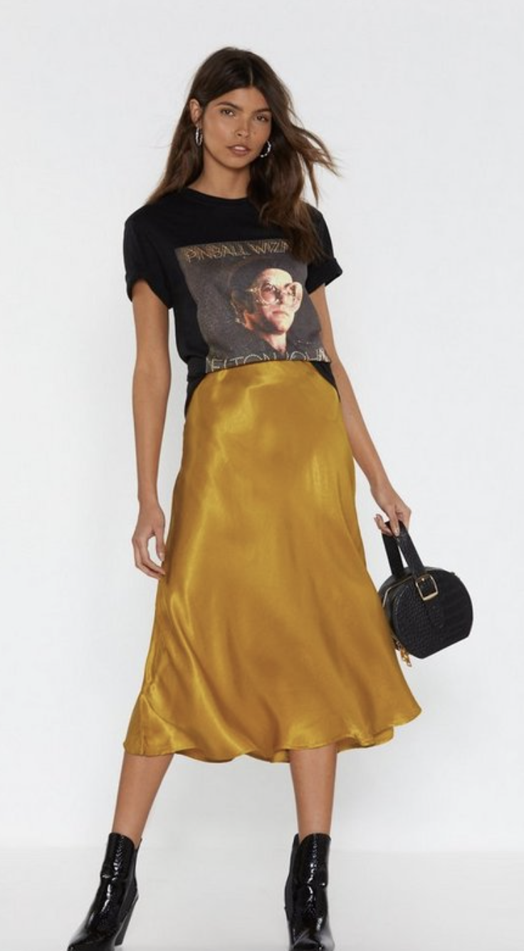Stick with your key shapes but in upgraded fabrics for more formal looks. Long, bias-cut skirts provide elegance for evening.