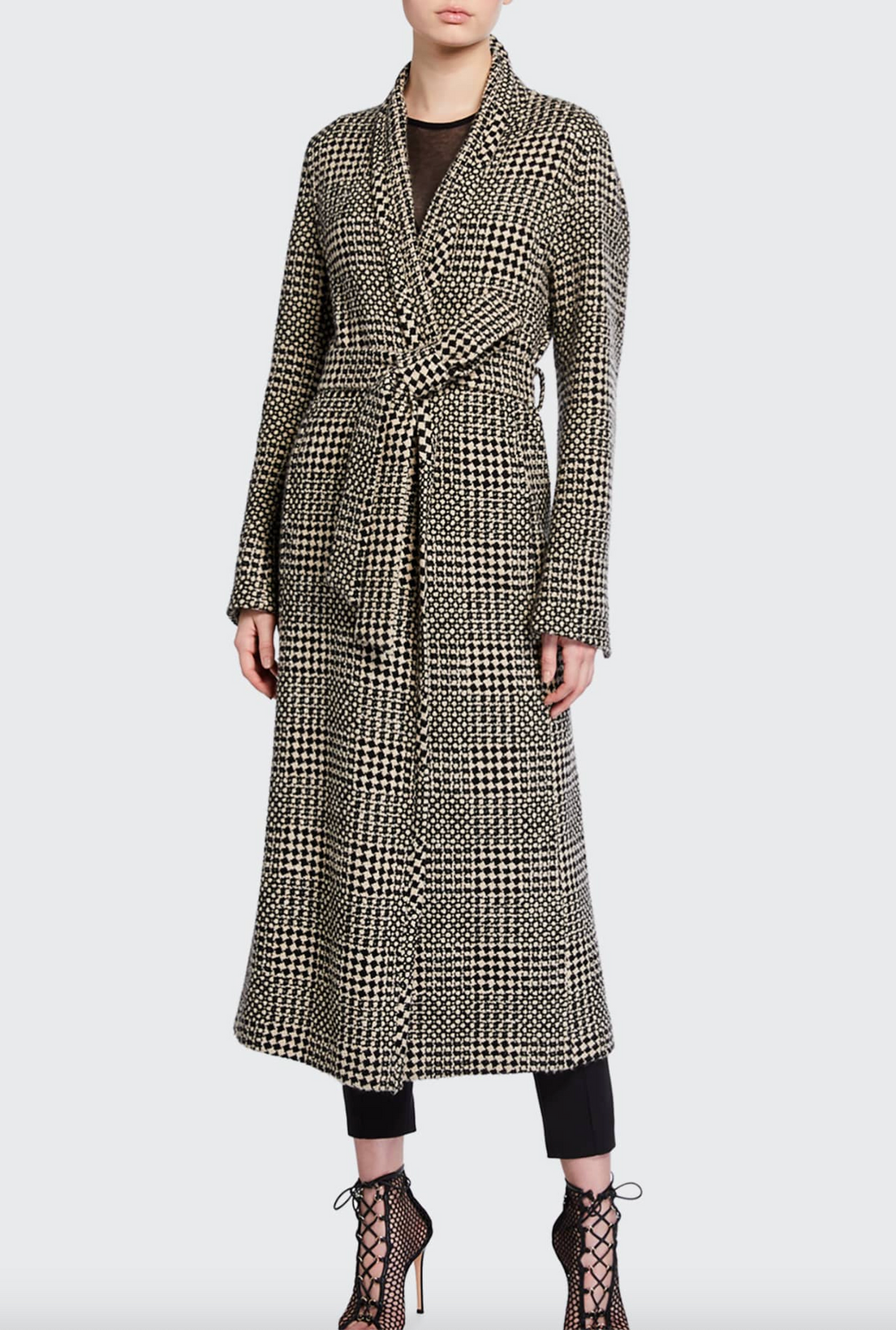 Try a long coat in cashmere, which is a Kibbe-recommended fabric for Dramatic Classics.